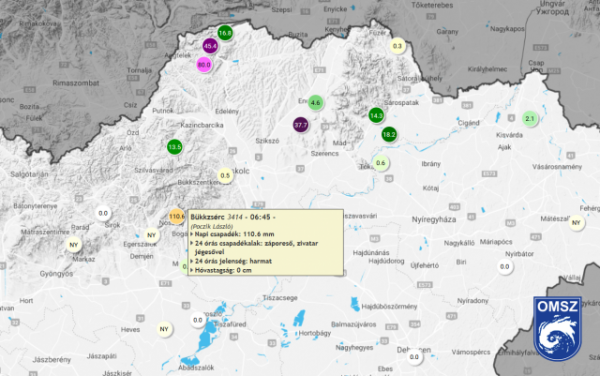 Az Országos Meteorológiai Szolgálat közleménye szerint az intenzívebb zivatarokból néhány helyen 30-80 mm csapadékról érkezett jelentés. A rekorddöntő azonban ennél jócskán több csapadékot kapott: a Borsod-Abaúj-Zemplén megyében található Bükkzsércen 110,6 mm csapadék hullott a térséget 11:20 és 13:20 között elkapó jégesővel is kísért viharos zivatargócból, felhőszakadásból.
