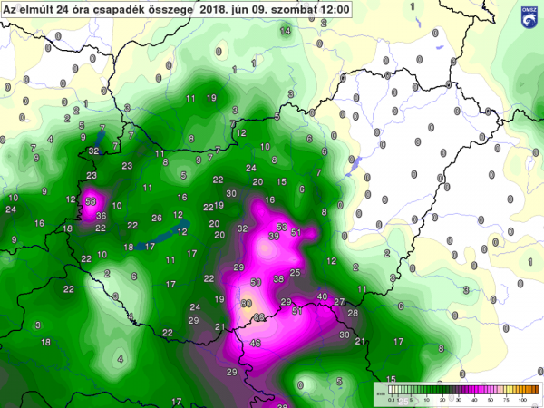 A szombatra virradó éjjel 2, majd szombat délelőtt még egy heves zivatarrendszerből összességében Bács-Kiskun megyében hullott a legtöbb eső. Ott helyenként a júniusi átlagot is meghaladta a 24 óra alatt lehulló eső (75 mm). Az északkeleti országrész ezúttal kimaradt, de szombat éjjelre még várható zivatar, mely akár azt a térséget is érintheti.