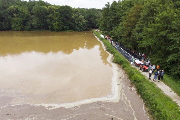 Hegyhátszentjakab, 2018. június 9. A gát megerősítésén dolgoznak szakemberek és önkéntesek 2018. június 9-én Hegyhátszentjakabnál, ahol a Vadása tórendszernél a két tavat elválasztó védműnél több helyen megcsúszott a föld, suvadások keletkeztek az éjszaka hirtelen lehullott nagy mennyiségű eső miatt. MTI Fotó: Varga György