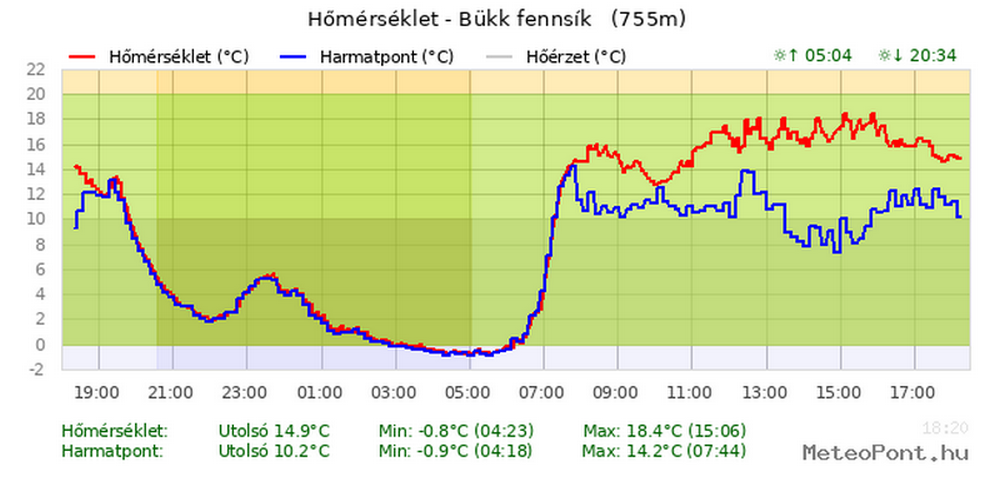 A MeteoPont Bükk-fennsíkon felállított állomásának hőmérséklet adatai 2020.07.12. 18:20 és 07.13. 18:20 között