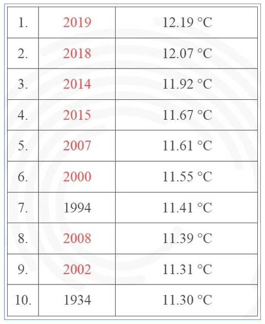 2019 országos középhőmérséklete 12,19 °C lett, ami az 1981–2010-es évek átlag értékénél 1,87 °C-al magasabb.