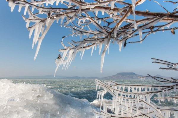 Jégcsapok egy bokor ágain Fonyódon, a tarajosra fagyott Balaton partján 2016. január 18-án. MTI Fotó: Varga György