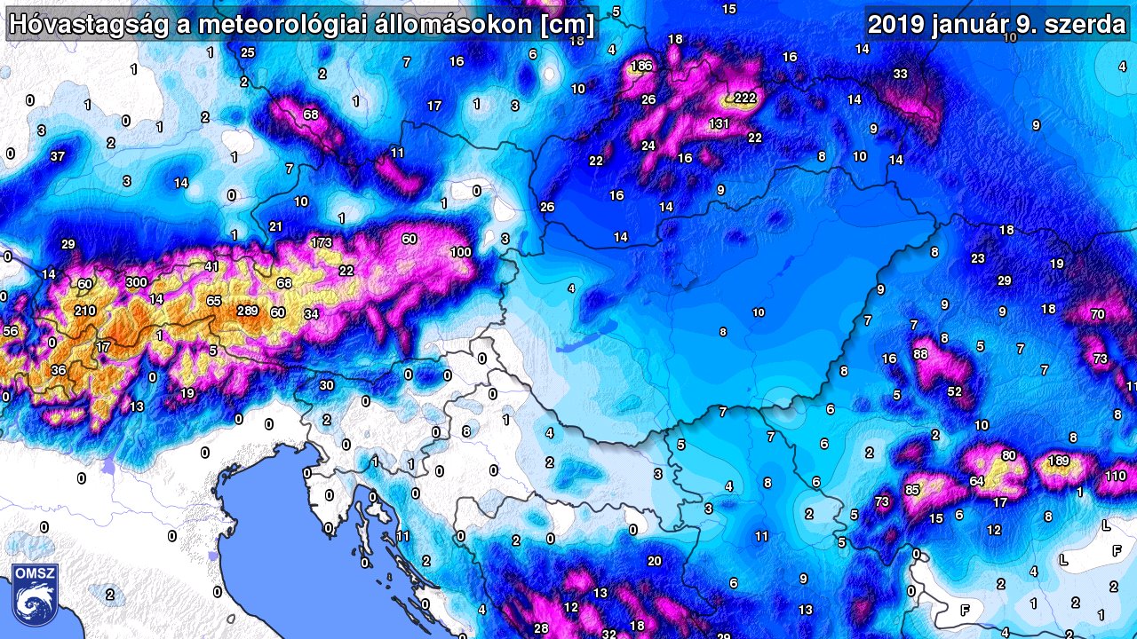 2019.01.09. reggel, meteorológiai állomásokon mért hóvastagság adatok. forrás: Országos Meteorológiai Szolgálat