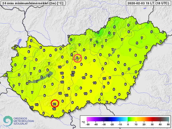 Az enyhe napot újabb enyhe éjszaka követte. Mind az országos, mind a budapesti legmagasabb minimum-hőmérsékleti rekord megdőlt 2020.02.03. hajnalán. Pécs Egyetemen csupán 10,6 fokig csökkent a levegő hőmérséklete (eddigi rekord 2017, Kaposvár, 9,6 fok).