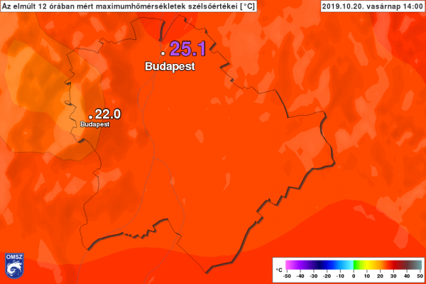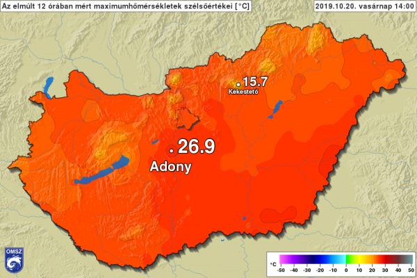 Maximum hőmérséklet 2019.10.20. 2:00 – 14:00 között (forrás: OMSZ)