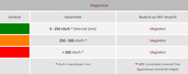 A háttérsugárzásból eredő egyenérték dózisteljesítmény mértékegysége a nanosievert/óra, rövid jele: nSv/h. Leírják, hogy a természetes háttérsugárzás átlag mértéke Magyarországon 50-180 nSv/óra körül ingadozik. Ez az érték függ a többek között a helyi természeti adottságoktól, pl. a tengerszint feletti magasságtól, a talaj típusától. Az ingadozást természeti hatások, időjárási körülmények (légnyomás, csapadék típusa, mennyisége és intenzitása) változásai is befolyásolják. A figyelmeztetési szint 250 nSv/óra, a riasztási szint 500 nSv/óra.