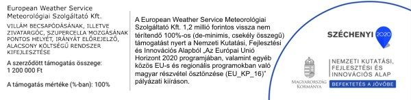 A European Weather Service Meteorológiai Szolgáltató Kft. 1,2 millió forintos vissza nem térítendő 100%-os (de-minimis, csekély összegű) támogatást nyert a Nemzeti Kutatási, Fejlesztési és Innovációs Alapból „Az Európai Unió Horizont 2020 programjában, valamint egyéb közös EU-s és regionális programokban való magyar részvétel ösztönzése (EU_KP_16)” pályázati kiíráson.