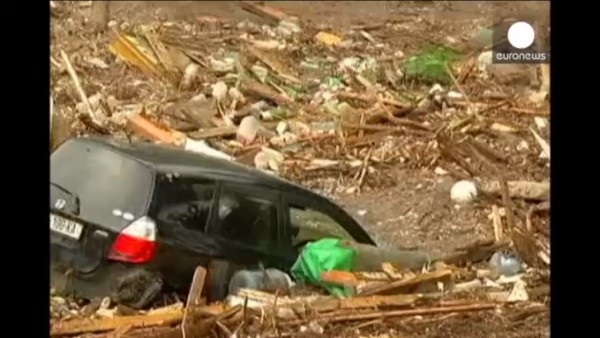 A heves esőzések miatt kiáradt a Vere folyó, az özönvízben pedig több tucat épület elpusztult. Az áradat autókat is elsodort.