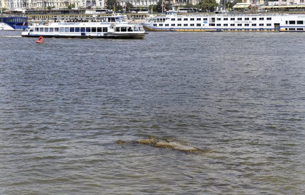 Az Ínség-szikla a Dunában, a Szabadság híd közelében, 2018. augusztus 13-án. Ez a szikla általában víz alatt van, de a budapesti vízmércén mért 95 centiméter körüli vízállásnál kibukkan a vízből. A Dunán Budapestnél reggel 93 centimétert mértek.
