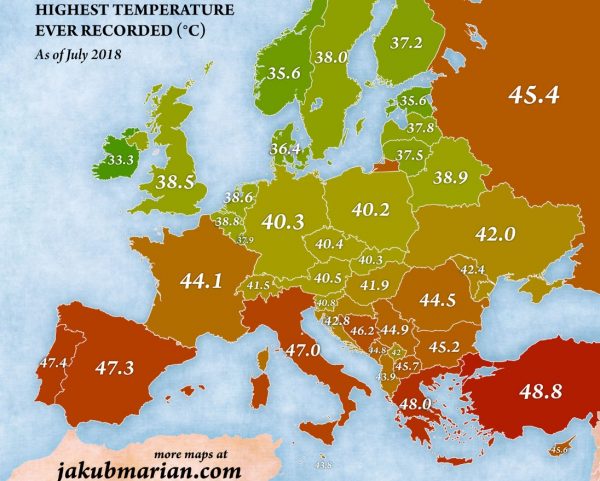 Az eddig hivatalosan, azaz ellenőrzött és hitelesített állomáson mért és hivatalosan rögzített európai maximum hőmérsékleti rekordok: