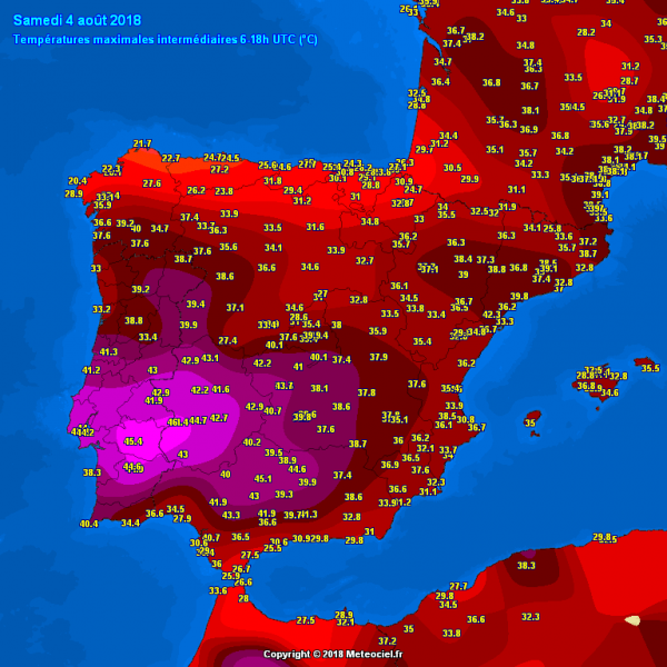 A legmagasabb hőmérsékletet a spanyol El Granado-ban mérték, ahol délután 16:00-kor 46.6 °C-ot mutattak a hőmérők, míg a második legmelegebb helynek Badajoz település bizonyult 46.0 °C-al, melyet délután 17:10-kor rögzítettek. Portugáliában a legmelegebbet az ország középső részén található Evora / C. Coord nevű településen lévő mérőállomás mérte: +45.4 °C.