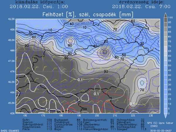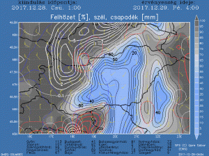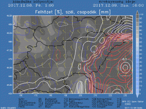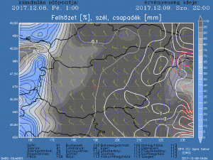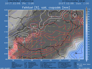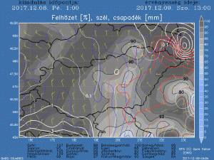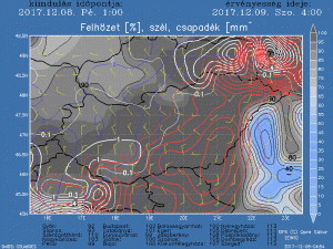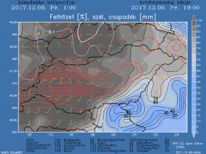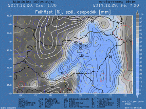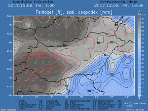 Íme a szombat reggeli modellfutás alapján szombatra, vasárnapra és hétfőre várt időjárás alakulása felhőzet borítottság, szél irány és erősség, valamint a csapadék eloszlás és halmazállapot (piros=eső, fehér=hó, pink=fagyott vagy ónos eső) tekintetében: