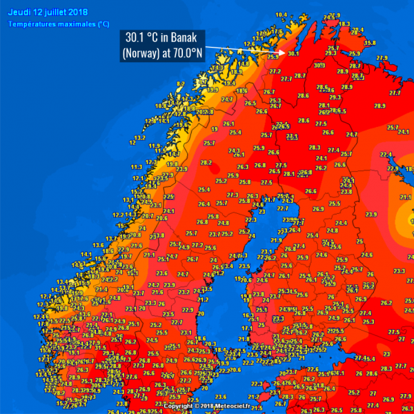 Múlt hét csütörtökön (2018.07.12.) érte el először a sarkkörön a maximum hőmérséklet a 30 fokot. Norvégia északi részén, Banak-ban 30.1 C fokot mértek. Azóta ugyan voltak pár fokkal kevésbé meleg, már-már az évszakos átlaghoz közelítő hőmérsékletű napok is, de összességében 30 fok körül ingadozik a térség hőmérséklete.