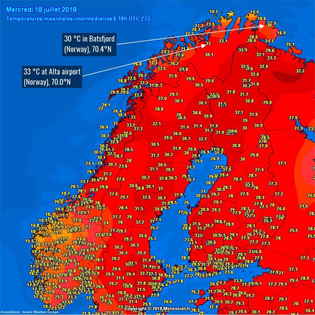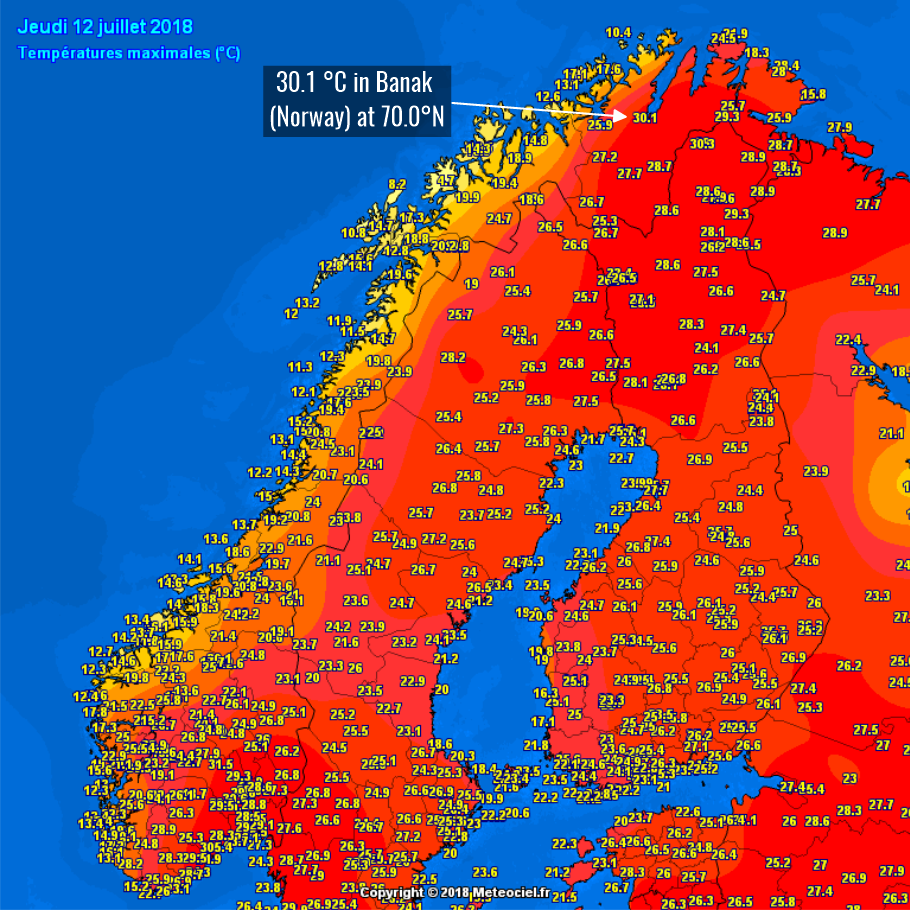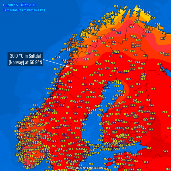 Maximum hőmérsékletek 2018 július 18-án, újabb sarkkörön túli, 30 fok feletti értékekkel (Forrás: meteociel.fr)