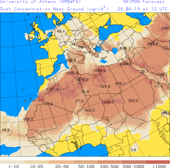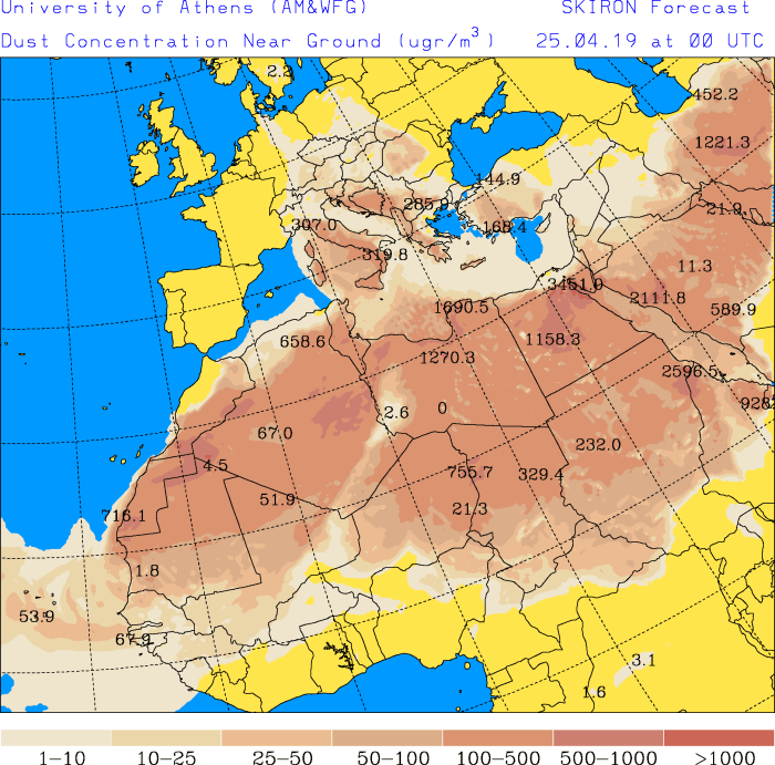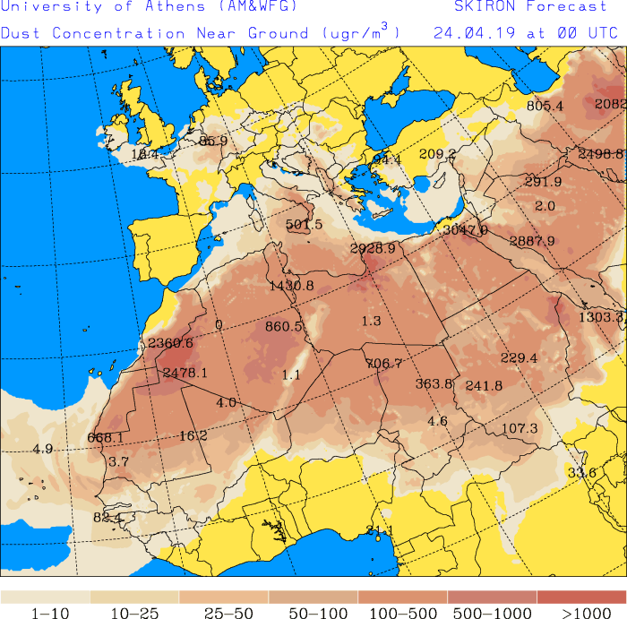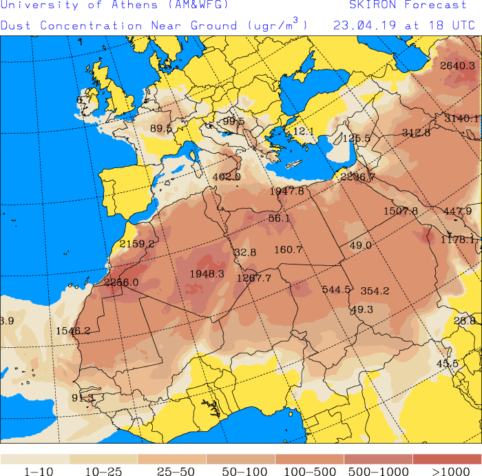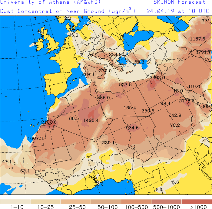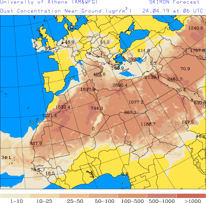 Az Athéni Egyetem Skiron előrejelző modellje a levegőben található porkoncentráció alakulását mutatja.